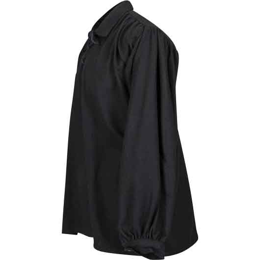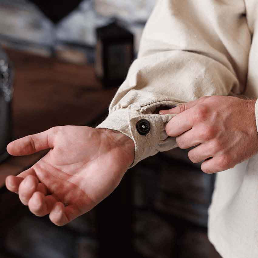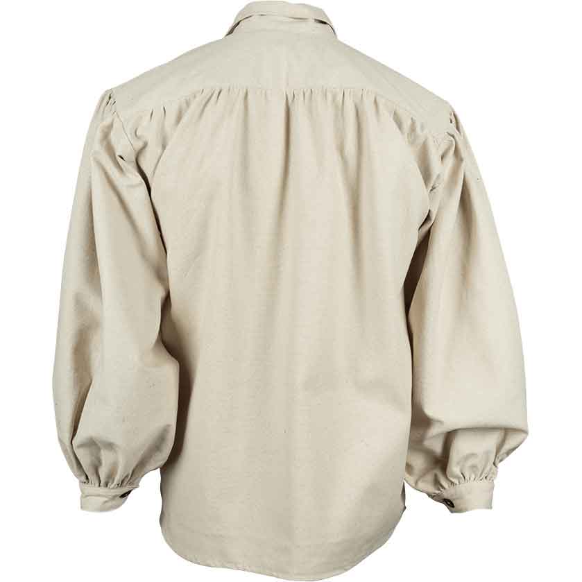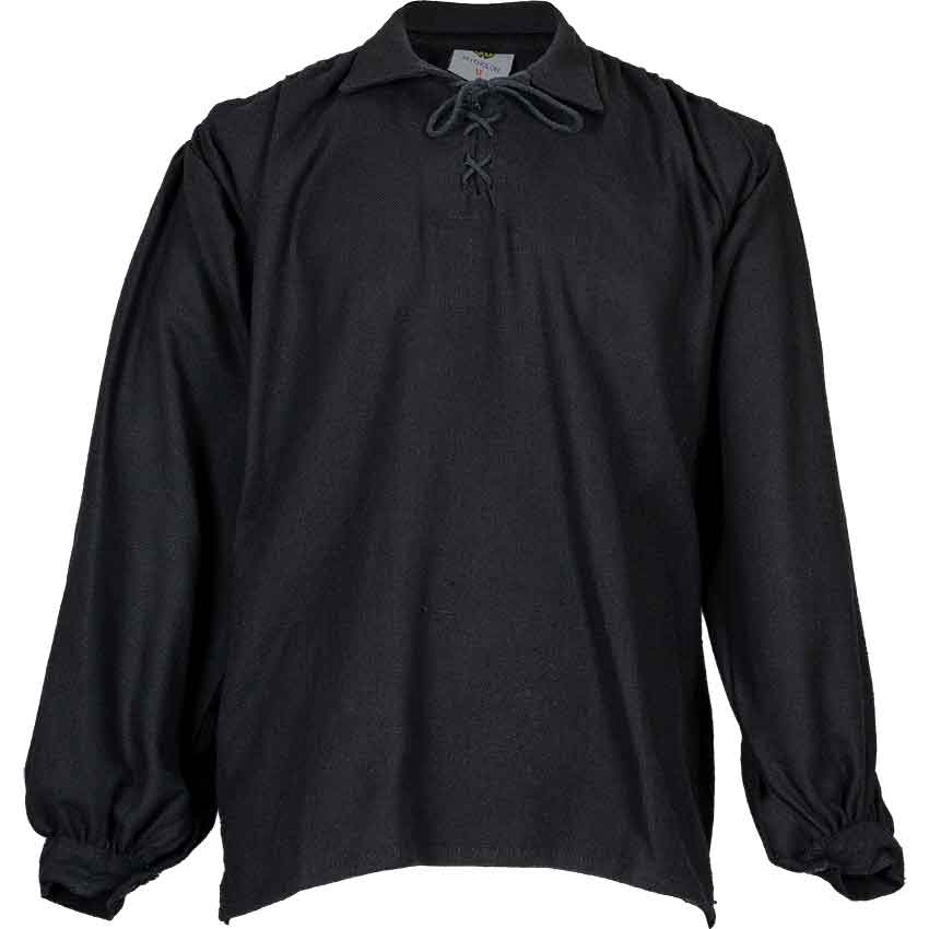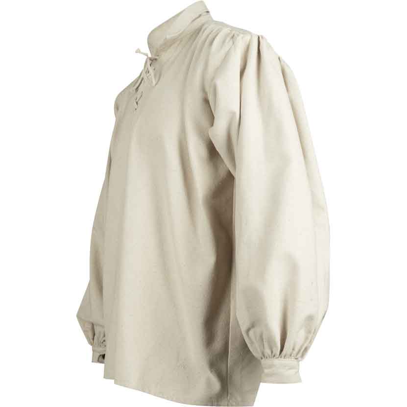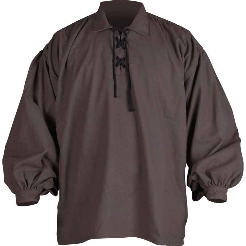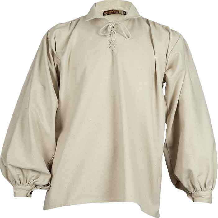 A great starting point for your next medieval ensemble, the Jonathan Shirt comes in a traditional design that can suit peasants, noblemen, or even pirates! The medieval shirt is made from cotton canvas perfect for Renaissance fair or historical re-enactment. The long-sleeved shirt features slightly puffy sleeves that button along the cuffs. The cutaway collar provides another striking element, and a string ties the neck. Available in black, brown, or cream, the medieval shirt can go well with almost any other period apparel.