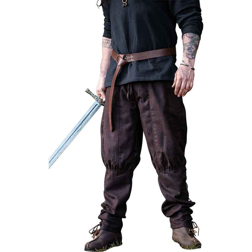 Crafted from a wool blend, these trousers are the perfect addition to your medieval outfit for adventures in colder conditions. These pants are colored brown for a natural, rustic look. These Viking trousers are loose fitting at the thigh and gather into a slightly closer fit right below the knee. They’re modeled after authentic Norse styles. These trousers come in multiple sizes, ensuring everyone feels like they belong in the Viking Age.