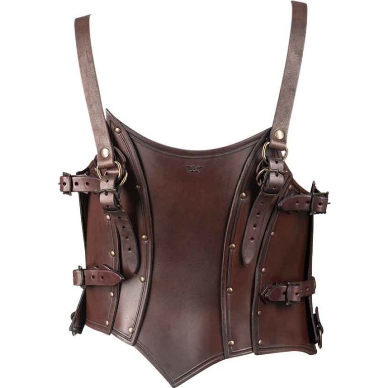 In the heat of battle, you stand tall, ready to take on any attack. The Kendra Ladies Cuirass guards your torso from the enemy while you march forth. Made from premium leather, this torso armour comes in brown, black, or bordeaux. It has front and back pieces. Straps and buckles connect the front and back, allowing the wearer to somewhat adjust the size. The shaped front fits up to a D cup. There are two sets of straps on each side. In addition, the cuirass rests on the body with shoulder straps. Next to the shoulder straps are buckles on the front and back. The buckles allow the wearer to attach gorgets such as the Kendra Gorget (MY100862). D-rings at the bottom allow for attaching tassets like the Kendra Ladies Tassets (MY101017). Riveting connects the different panels of the front and back sections of the cuirass. Streamlined embossing adorns the edges of the panels as well as the top and bottom of the cuirass. The bottom edge has a scalloped shape while the neckline has a cutout design. This ladies cuirass is a wonderful addition to an outfit for a fantasy convention or LARP event.