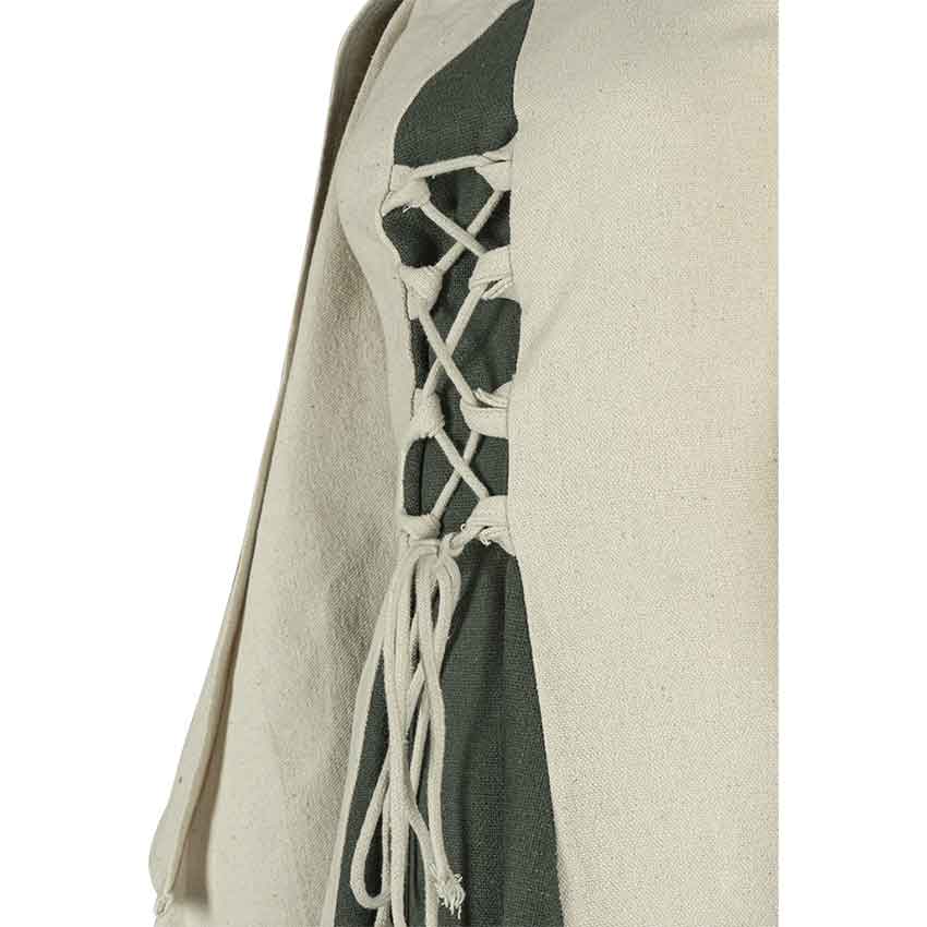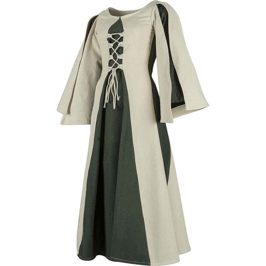 The fair maiden who dons the Kirian Girls Dress belongs to a kingdom ruled by a monarchy and defended by knights in shining armour. Perfect for the festive atmosphere of a renaissance fair or an exciting adventure within a LARP realm. Handmade from cotton, this dress takes inspiration from medieval fashion trends. The weave of the fabric enhances its authentic appearance with the added benefits of comfort and sweat absorption. The long-sleeve dress is two-toned with a built-in overdress and open sleeves in a shade that contrasts with the base layer. Cotton cord laces up the front and back, allowing you to adjust the fit.