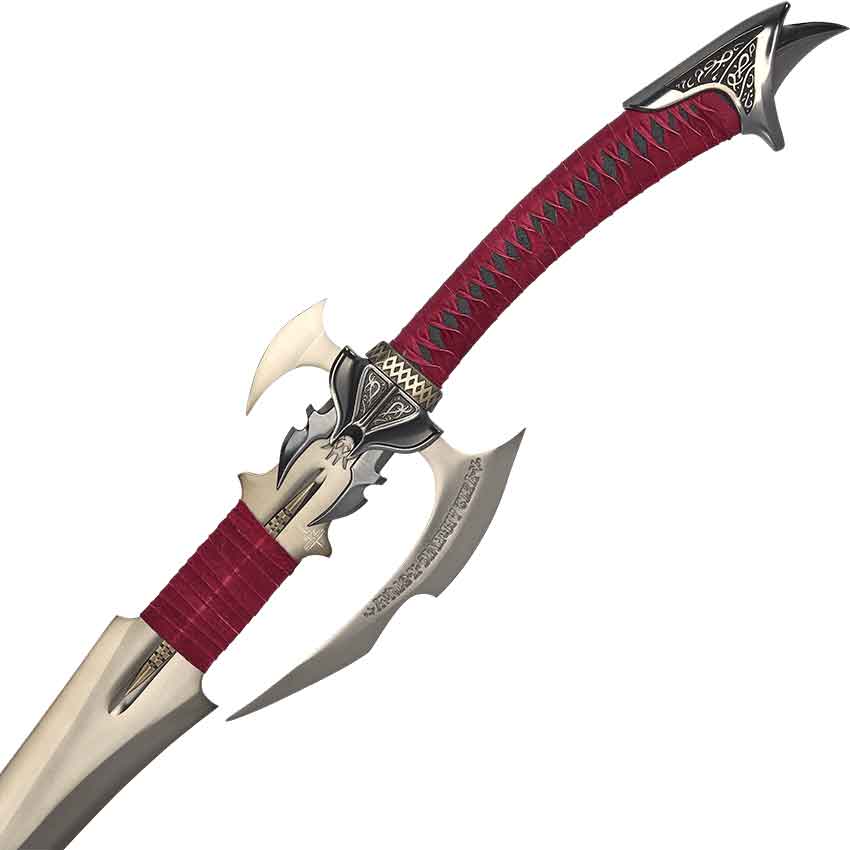 This second blade has a small, pointed arm on one side and a longer edge on the other. This curved blade features an inscription that reads Avoloch Will Yield to None but Truth in Anglecal runes. The center of this section features two fang-like points that face towards the wrapped ricasso.