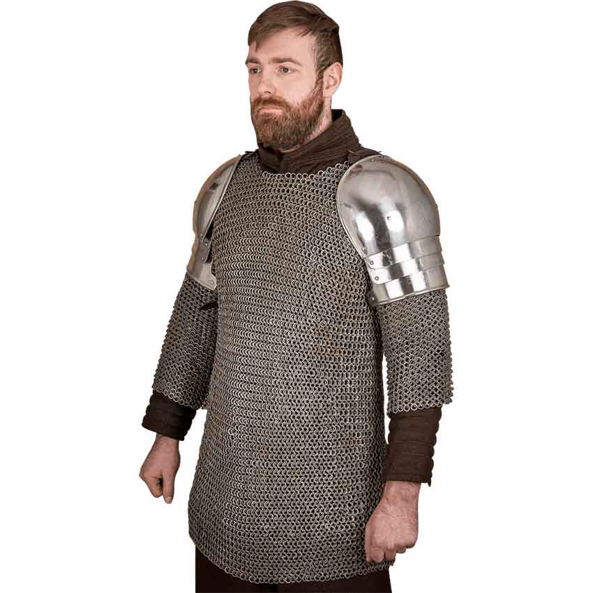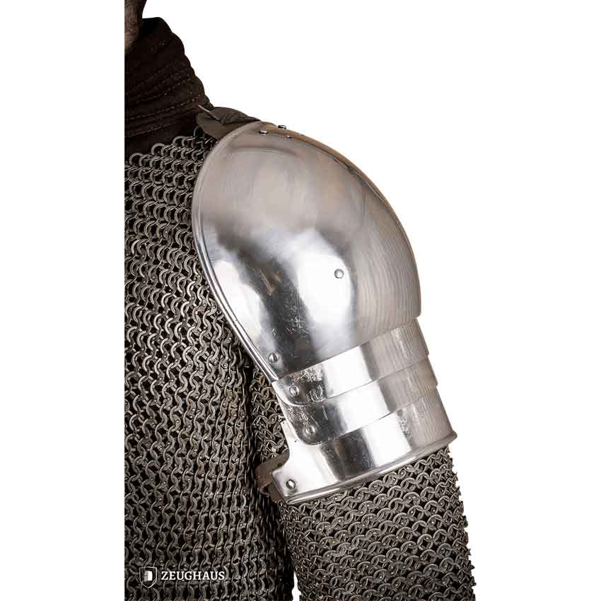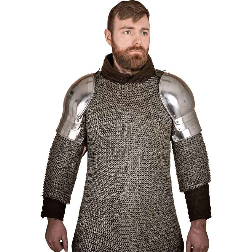The pauldrons feature overlapping plates, with the shoulder plates being the outermost layers. These pauldrons feature a rounded top edge. Then, under that, the pauldrons protect the upper arm further with layered plates of steel. They provide a robust and historically accurate design.