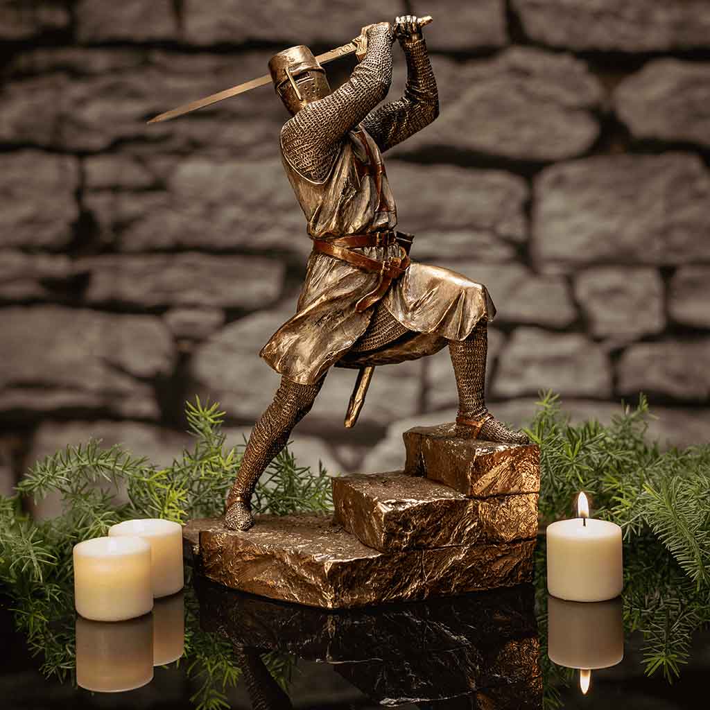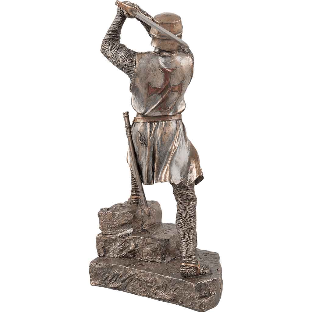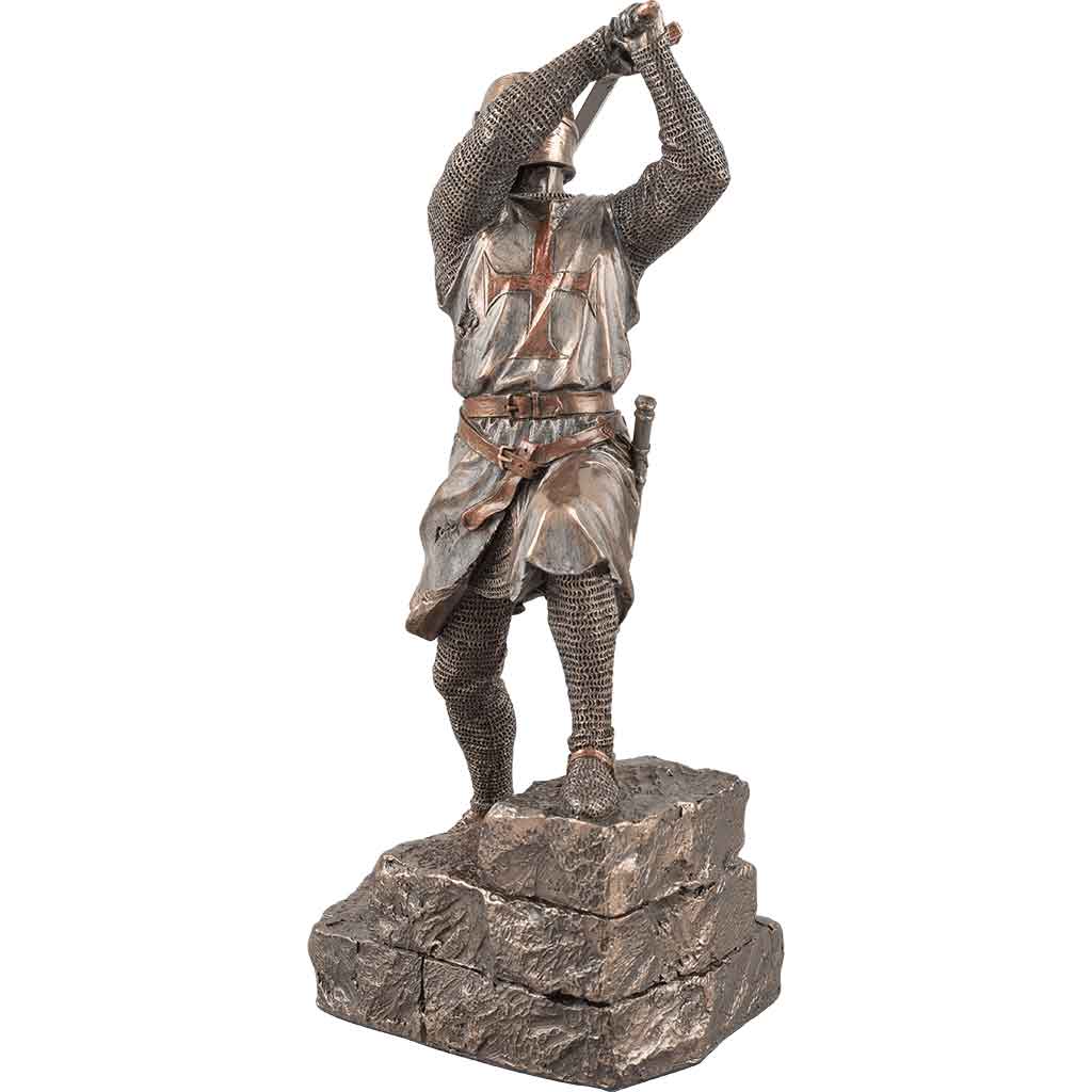 Members of the Knights Templar had to fight with many weapons. The Knights Templar with Two Handed Sword Statue shows one knight ready to attack. Made from cold cast bronze, this hand-painted statue depicts a member of the Knights Templar standing on a series of stone-like steps. His left leg is higher than his right leg. He holds a sword behind his head, as if getting ready to swing it. The knight wears a great helm. He also has on chainmail with a tabard over the top. The tabard displays a red Templar cross. This statue complements the Kneeling Knights Templar statue (WU-2064), sold separately. Add this knight statue to your medieval home décor or Crusader statue collection. It also makes a great gift for any fan of knights or the Crusades.