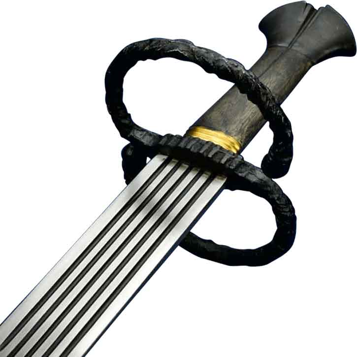 This historical Landsknecht sword comes with a wooden scabbard wrapped in black leather. Leather strips are wrapped around the top of the scabbard. The topmount and the round shape are made from brass. For added detail, the chape at the bottom of the scabbard has a fish-tail pattern.