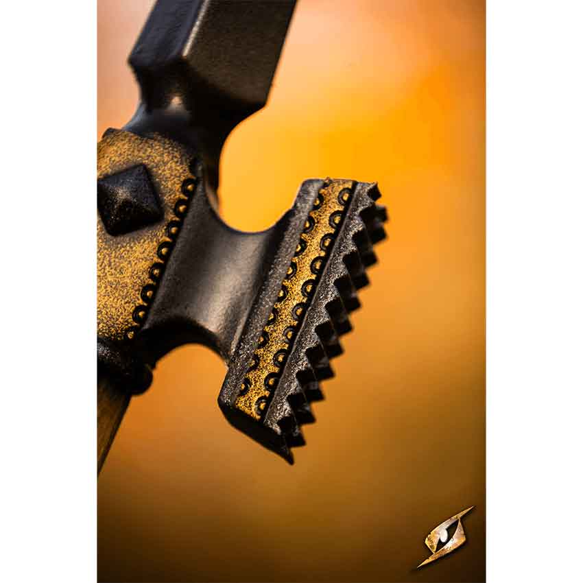 This LARP standard top is painted iron grey for a forged finish. The rest of the standard topper is painted with a wood-like finish for realistic detail. It’s designed like a classic halberd head. The axe blade is in the front, complete with a fuller-style accent and an angled tip. Above the axe blade is a broad spear. In the back, this poleaxe has a hammerhead with a golden accent and ringed bordered trim down the sides. The cheek of this polearm head also has a golden accent with ring bordered trim.