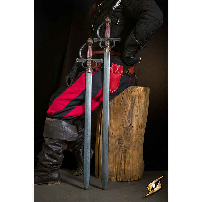 Perfectly suited for musketeers and nobles, the LARP Rapier Rillet in Red has a long, slender blade. A central ridge along its entire length results in a diamond cross section. This thin, long blade shape is perfect for speedy slashes and precise thrusts. This sword style takes overall inspiration from 16th and 17th century designs.
