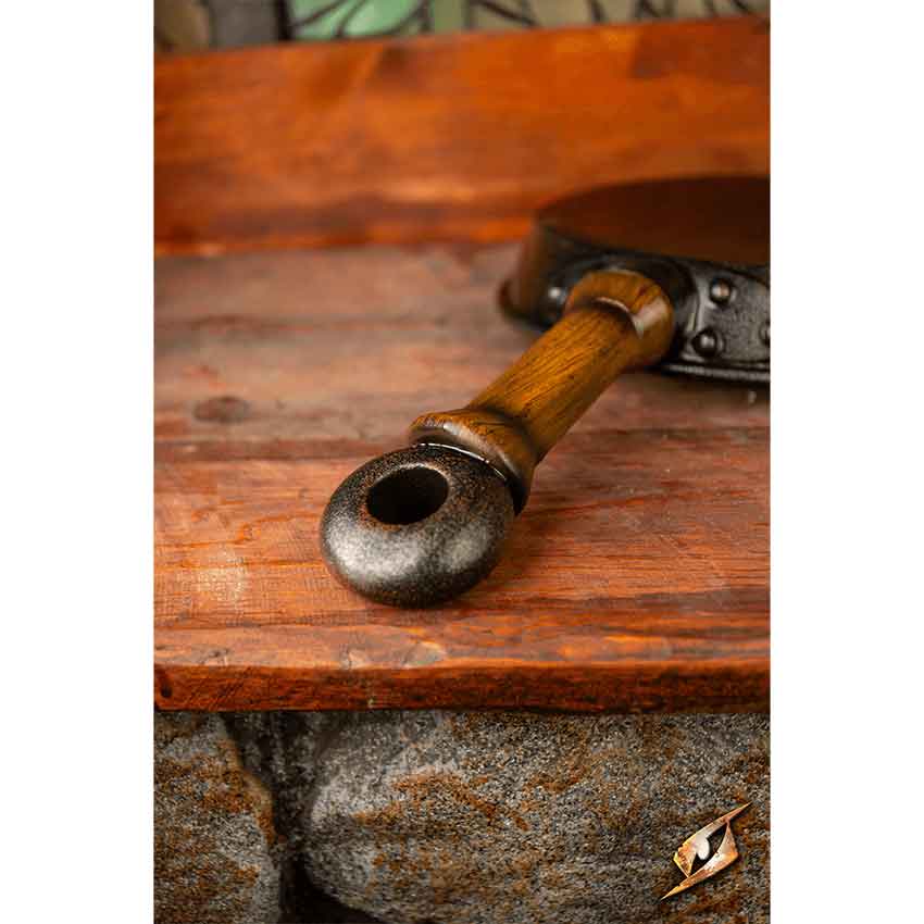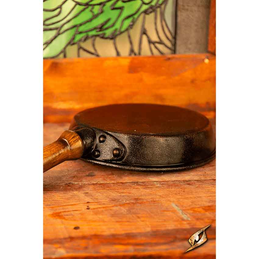 The handle is painted with a brown wood-like finish, ending in a grey ring pommel. This ring makes it easy to tie to your LARP outfit. Like the pommel, the circular pan is also painted grey with a forged finish for a hint of medieval detail.