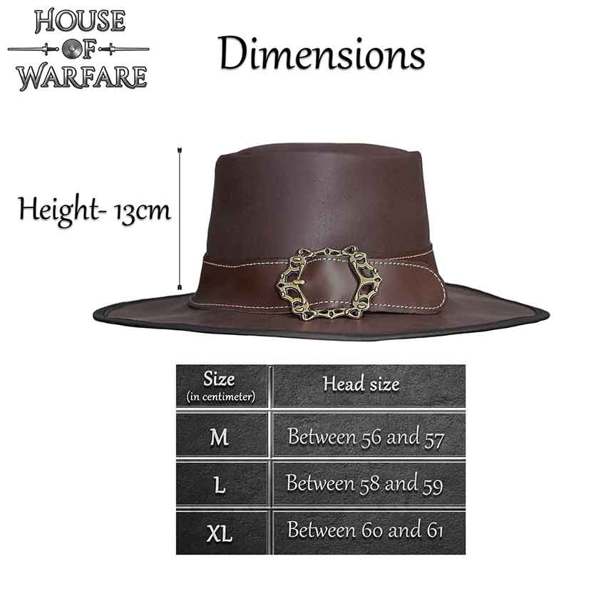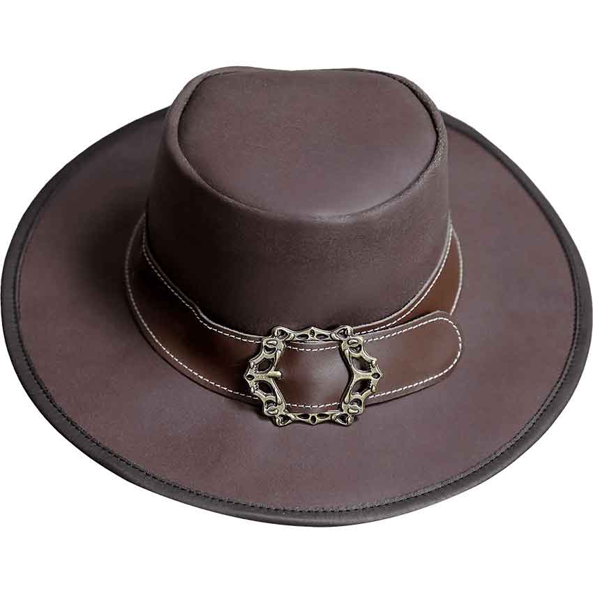 Does your character fight against Dracula, Billy the Kid, or some supernatural creatures? Add the Brown Leather Wide Brim Hat to your look. Made from leather, this brown medieval hat comes in three sizes. It has a wide brim with a banded edge. Tilting the Old West hat down will easily add a sense of drama and mystery to any look. A short leather band wraps around the base of the crown. There is a scrolled brass buckle in front. The crown and brim have a smooth finish. There is an internal wire at the edge of the brim, helping it to keep its shape. This sleek leather hat fits a wide variety of aesthetics and settings. Its versatility is a must for any fantasy or historical wardrobe. Wear this leather witch-hunter hat to your next Ren faire or cosplay. It also works well in a theatrical production.