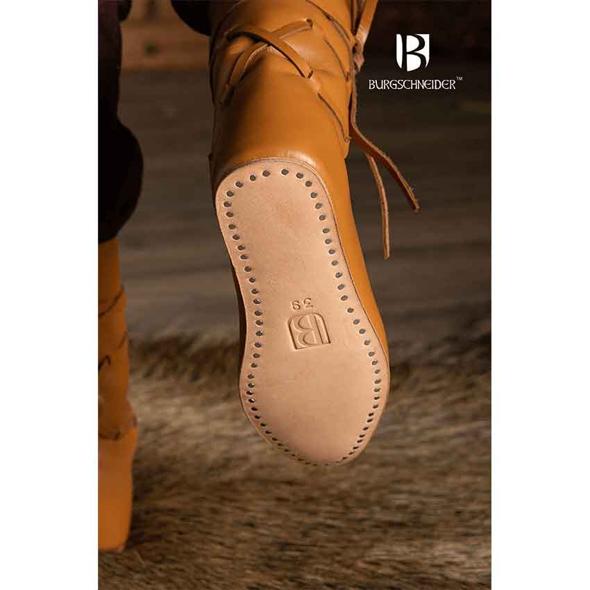 Constructed from high-quality leather, they boast durability and provide comfort fit for both the bustling city streets and the rugged paths of medieval landscapes. Their rich brown hue exudes the rustic charm of the bygone days, making them a perfect pair for history buffs and fashion enthusiasts alike.