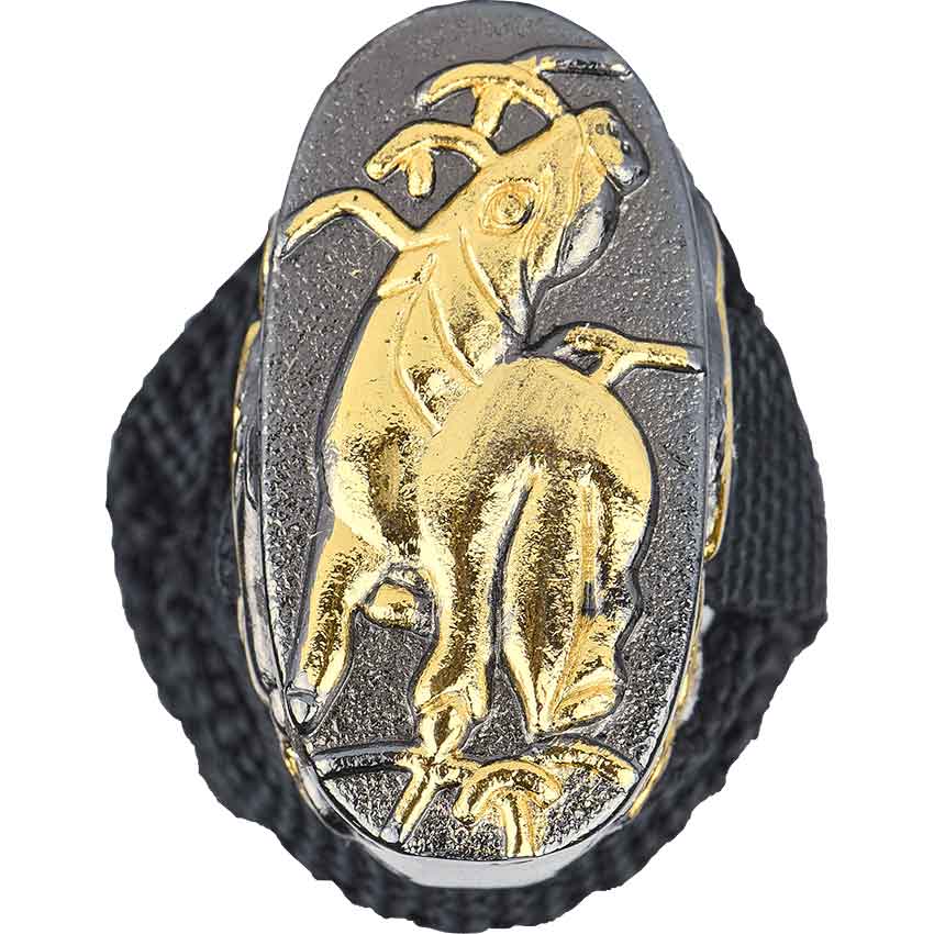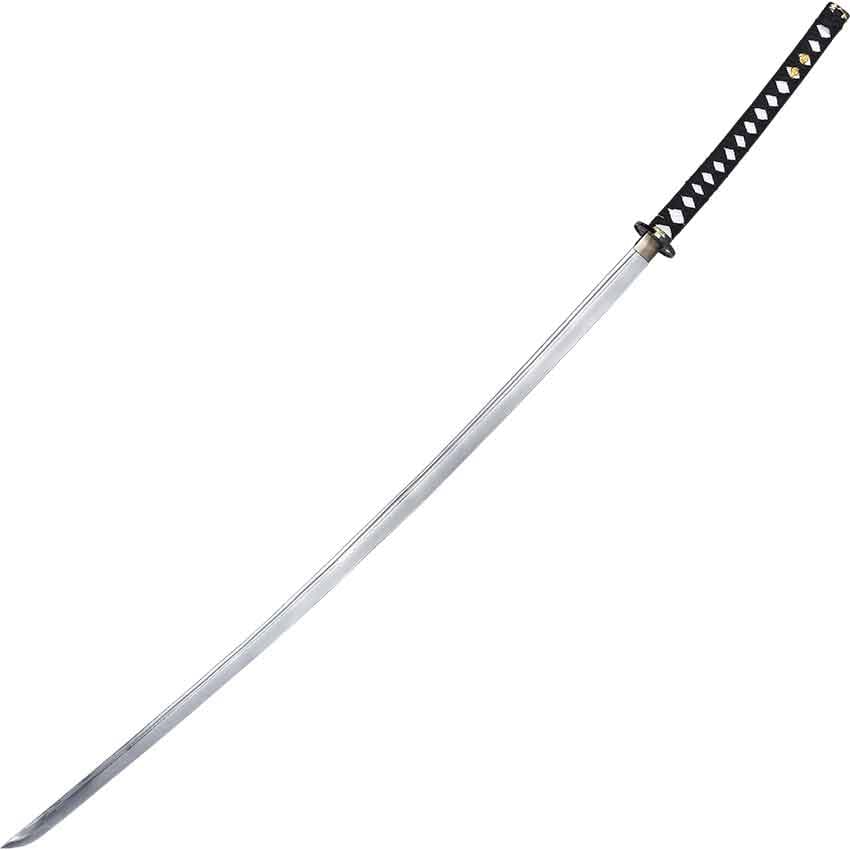 The size of a weapon often adds to its impressive appearance. The Long Dragon Odachi is no exception to this rule with its over five-foot length. This odachi has a long stainless-steel blade. A fuller runs down the length of the blade. The blade enters into the handle at a bronze-colored tsuba. A dragon adorns the tsuba. Next, the decorative weapon continues with a traditionally wrapped black handle. Finally, the odachi comes with a matching black scabbard. It adds a touch of ferocity to any decor. Display it on a wall in your home or office.