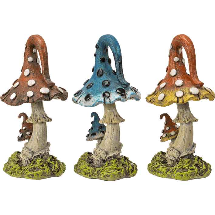 One of the mushroom statues has an all red cap design with dark shading and white dots. Another design features rich blue caps with white edging and black dots. The third mushroom statue has red caps with yellow edging and white dots. This fantasy mushroom set makes a great addition to any fantasy home decor. Also, they look right at home in a fairy garden display.