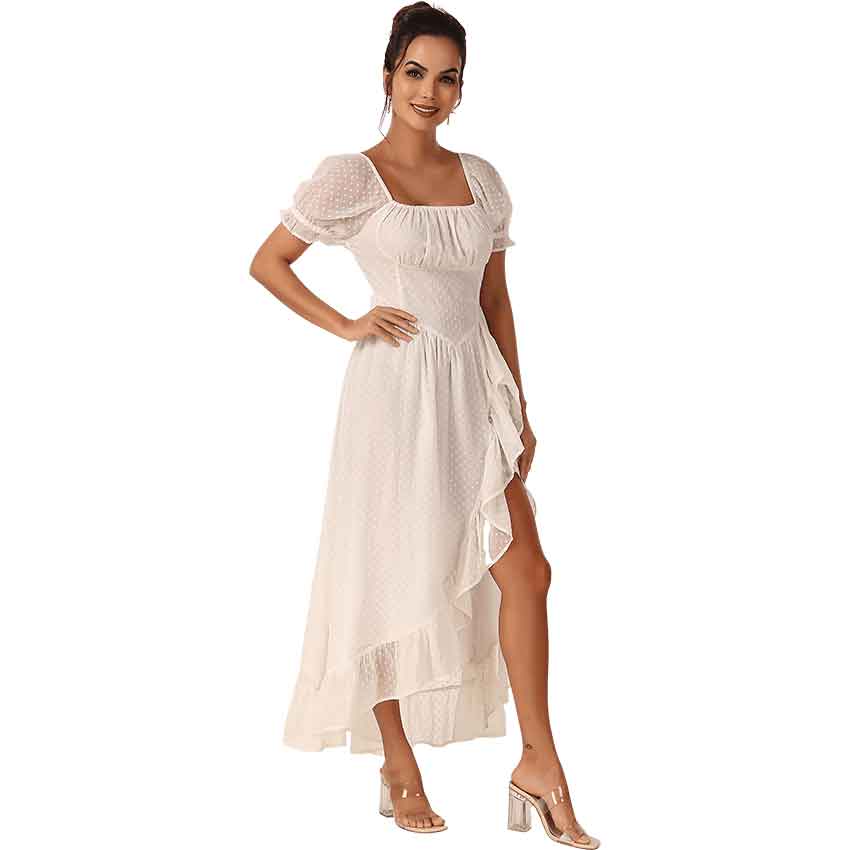 - Design Details: Features a square neckline, short puff sleeves, and a V-shaped gathered waist for a flattering silhouette.