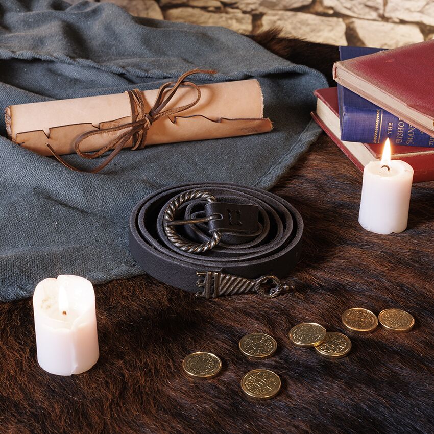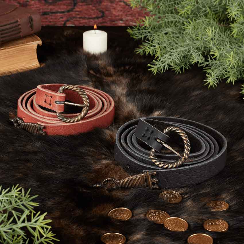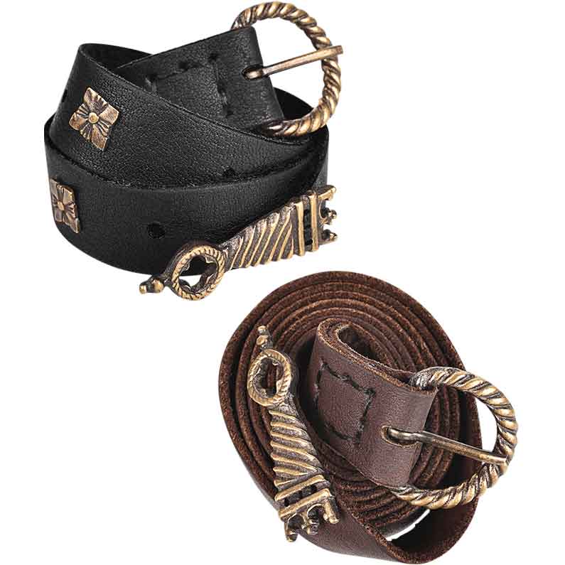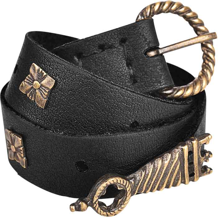 With fine detailing fit for a variety of medieval inspired outfits, the Mattis Belt features a brass buckle, tip, and five blossom-shaped decorations. This belt is made of thick leather and available in multiple colors. The circular buckle features a classic twirling design while the tip of the belt depicts a crown and elegant cross design. Perfect for nobility, this sturdy and stylish belt is a great way to easily heighten the style of your favorite historical reenactment or LARP outfit.