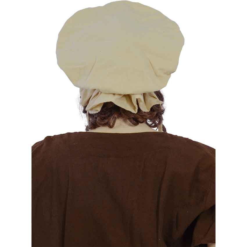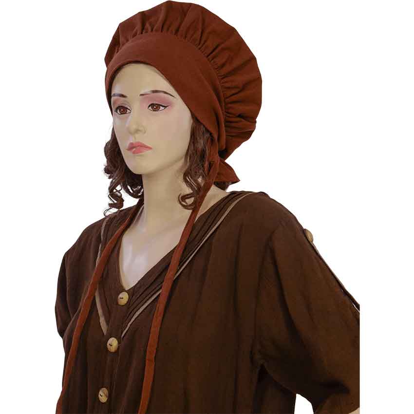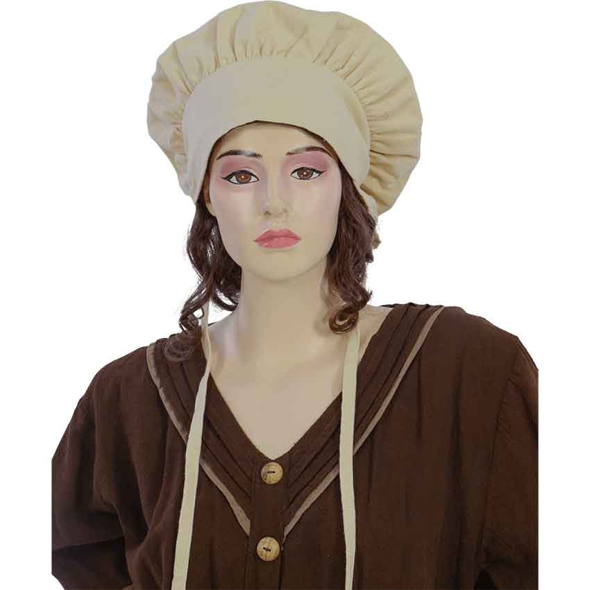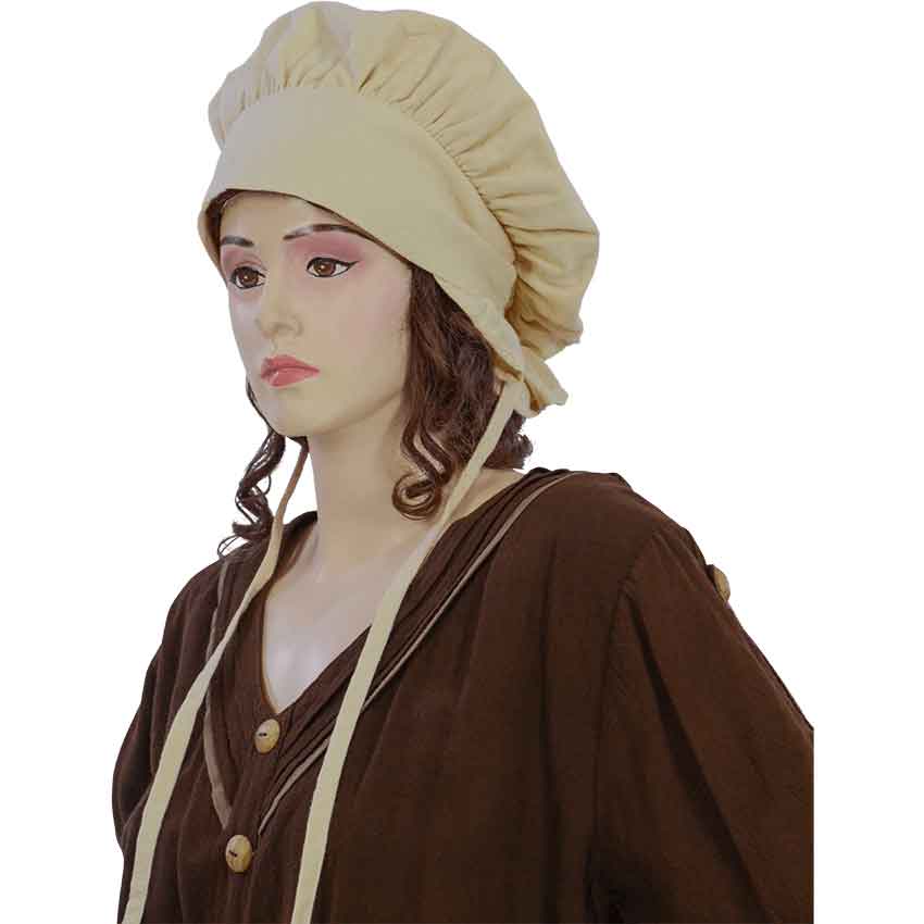 The Medieval Bonnet is the perfect accessory for a great variety of historical looks. Made of a natural, medium weight cotton, this womens medieval hat is available in a variety of colors to suit your style and match your outfit. The roomy crown of this cotton peasant bonnet is gathered at a wide front band, and long, matching fabric ties secure the hat in place. Great for townsfolk, shop keepers, medieval maidens, and more, this versatile cotton bonnet lends a charming touch of detail to historical ensembles.