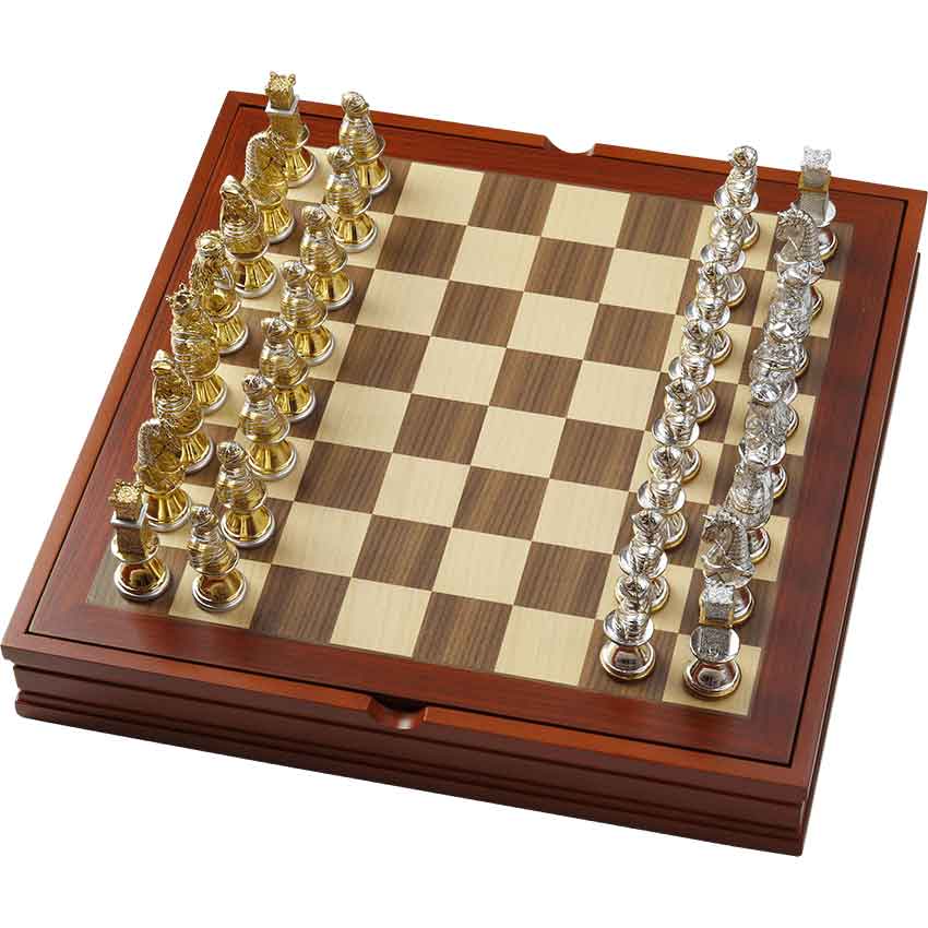 For those who enjoy a great game of chess or simply love to collect chess sets, the Medieval Chess Set with Box Board is a wonderful option to choose. Made from zinc alloy, these chess pieces come with a board. The basswood board doubles as a storage box for the pieces. Half of the pieces have a lustrous golden color with silver accents while the other pieces are colored in reverse. Those pieces have a silver color with golden accents. The pieces designs help to easily determine their position. For example, the knight piece is a horse bust while the rook resembles a tower. The pawn looks like an armoured soldier as well. Within the box, each piece has its own compartment, keeping them well organized. Add this chess set to your home or office decor. It also makes a great collectible.
