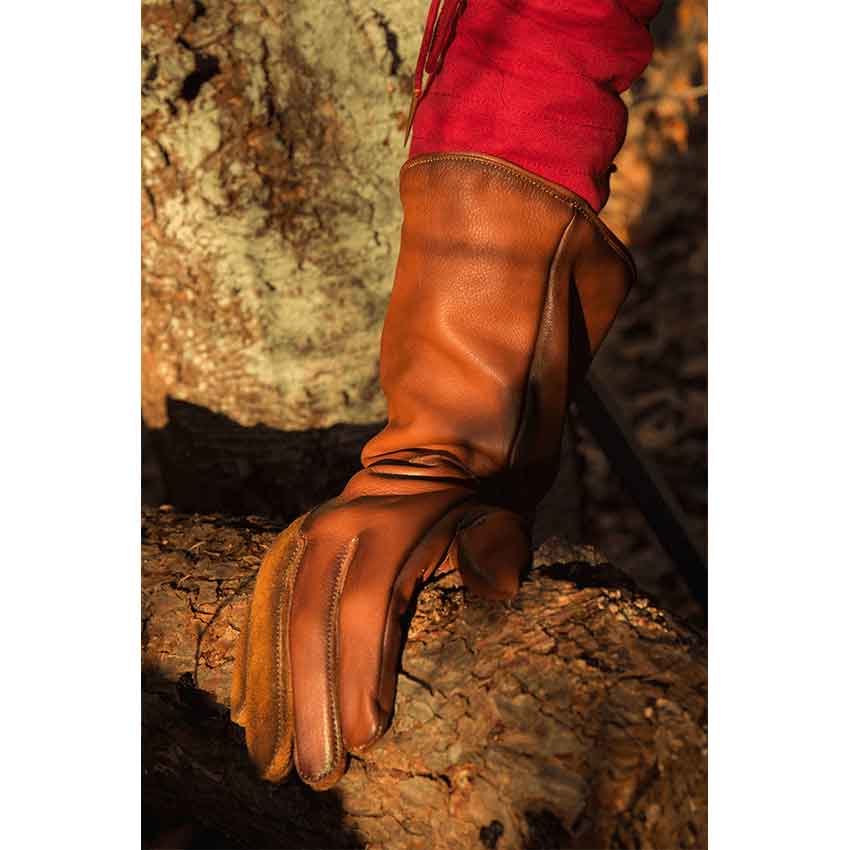 Whether you are fond of birds or simply need a good pair of gloves to round out your historical outfit, the Medieval Falconers Gloves will do the trick. These forearm length gloves are made of leather with select suede detail. Fitted at the wrist, the gloves flare out gently and end halfway to the elbow, making them great for layering over long sleeve shirts. Laces up the outer sides allow for impressive adjustability while adding intricate style. The last two fingers of each hand and half of the palm are made of matching suede. Perfect for all manner of knights, nobles, and other characters from fantasy or medieval eras, add detail and protection to almost any outfit with these sturdy and versatile leather gloves.