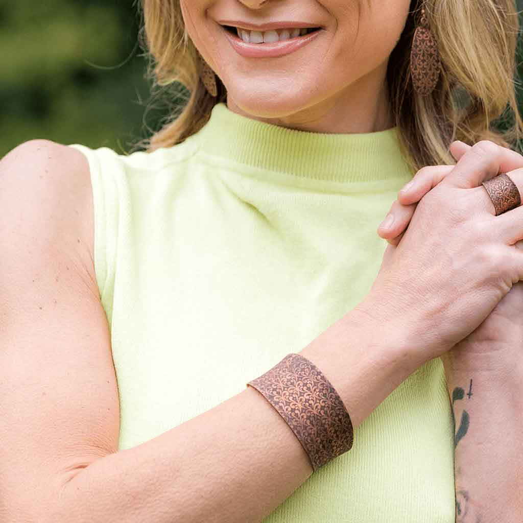 Crafted by hand from skilled artisans, this medieval cuff bracelet gives your look another layer of detail and elegance. This medieval copper wrist cuff has an open cuff design with rounded ends, so it is slightly adjustable. The cuff is concave slightly and decorated with baroque flourishes. There is a patina on this wrist cuff. Patina is the brown film layered over the design to give it contrast and a vintage, aged finish.