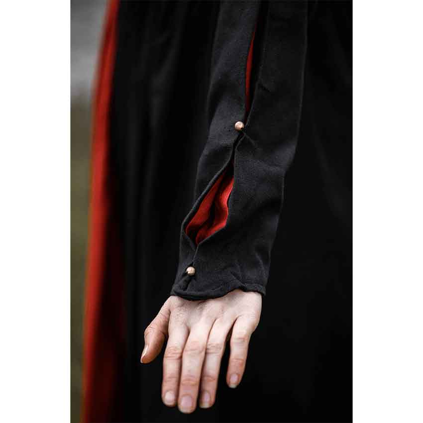 Crafted from cotton, this gown has an elegant aesthetic. This dress has a two-tone color scheme. This means the outer panels and the outside of the sleeves are black while the inner panel, the lacing, and the sleeve inserts are red. This adds layers of detail to appreciate.