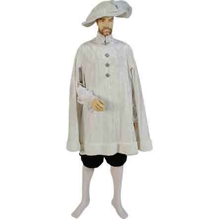 This stunning garment has an extravagance that is fit for a king. The Men’s English Houppelande is styled after the houppelande of the 15th and 16th centuries, this style of garment was favored by Henry VIII of England, of the Tudor Dynasty. This incredible garment is made from heavy, luxurious crushed velvet, giving this garment a softness and luster that almost have been felt and seen to be believed. Nothing short of regal in appearance, this garment features accents of fine lace trim as well as white faux fur trim on the hem and cuffs that blends perfectly with the white velvet. The shoulders and arms of this garment are actually surprisingly simple, like most houppelande, the sleeves are longer then full-length and are extremely loose-fitting, this garment is actually designed in such a fashion that the sleeves can either be worn, or the arms can be left uncovered while the sleeves hang freely at the sides. The Men’s English Houppelande is fully-lined with satin, which makes the garment that much more comfortable to wear. This men’s gown is pictured above with a matching hat, a shirt, and breeches, please take note that the hat, breeches, and shirt do not come included with the houppelande. The Men’s English Houppelande is an extravagant men’s gown that conveys a royal look and bearing, it’s fantastic for kings and princes at Renaissance fairsand even better for grooms, at renaissance weddings.