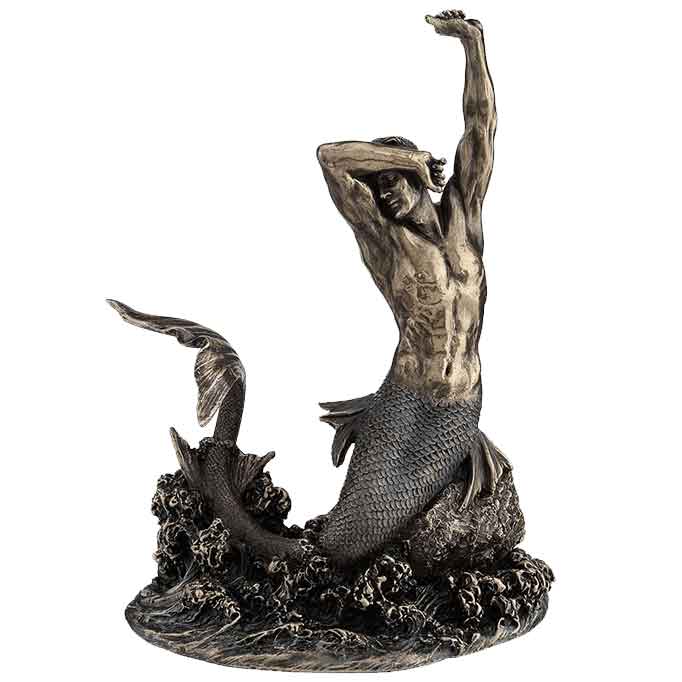 Summoning storms to wreck ships is exhausting. Or perhaps this merman has simply been napping in the sun. Arching his back and reaching one arm over his head, this Merman Stretching on Rock is a striking addition to any aquatic decor. Though not as prominently displayed as their female counterparts, mermen have existed in the folklore of many cultures around the world. Crafted from cold cast bronze, this fantasy merman statue is hand-painted to achieve a lustrous finish. His intricately detailed tail has been painted blue, and the stormy sea that crashes on his rock is dark. He sits with eyes closed, his face partially obscured by his right arm. His tail is curved, the fin level with his waist, and sitting at the surface of the waves. Perfect for fans of mythology and fantasy, this Merman Stretching on Rock makes a perfect gift for you or a loved one.