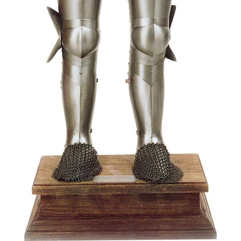 An exquisite display of 15th century style Italian armor, the Milanese Full Suit of Armor is an extraordinary replication of a suit crafted by the famous Italian armorers the Corio family, which was crafted around 1440. The original suit is on display in the Glasgow Museums in Scotland. This is a wearable replica set and features the classic Milanese style of smooth steel plates. A Venetian style sallet tops this suit with its T-shaped opening on the face, helping to date this exceptional armor. Like the original, this set of armor is handcrafted in Italy from high quality steel. The armour secures to the body with straps. A rectangular wooden pedestal is included with this suit, acting as a perfect platform on which to display this elegant historical recreation. The Milanese Full Suit of Armor is an unbelievable home or office decoration which will radiate your passion for the medieval era and European history.