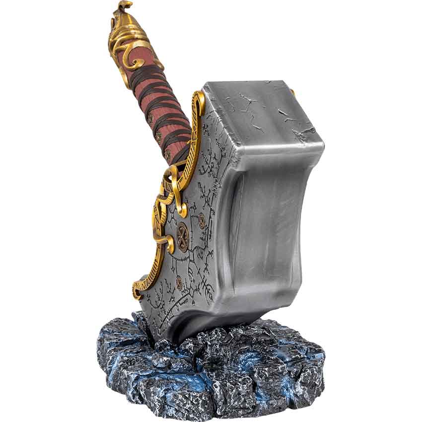 The resin handle has a wood-like texture. Its wood finish gives it a realistic look. The wood-like handle has dark brown wrappings carved on it for added depth and dimension. Three golden ring accents adorn the handle. The golden pommel is crafted to look like two horned beasts facing one another. The golden beasts in question have intricately carved grooves. This Mjolnir replica comes with a display stand. The grey display stand is made of resin. It is crafted to look like ancient stone with lightning crackling through it in light blue accents.