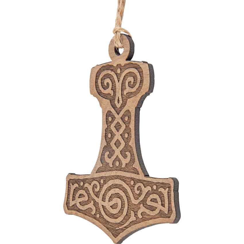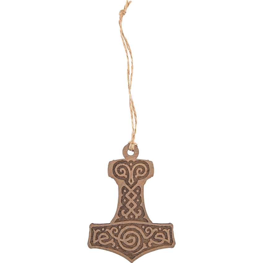 For Yule or Christmas, the Mjolnir Wooden Christmas Ornament will bring a Viking flair to any holiday celebration or space. Made from solid walnut, this Viking ornament comes as a single piece. The Norse ornament has a hole at the top. The hole attaches to a rustic twine string for hanging. On one side, the Christmas ornament depicts Mjolnir, the mythical hammer of the god Thor. A pair of swirled lines adorn the top. There are crisscrossed lines in the middle. Additional swirls adorn the bottom of the hammer. This ornament looks great hanging on a Christmas tree as well as with other holiday decorations.