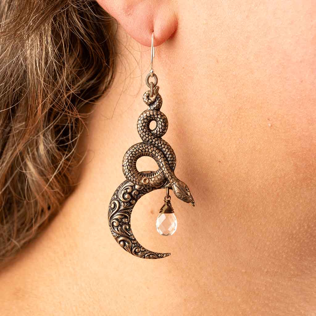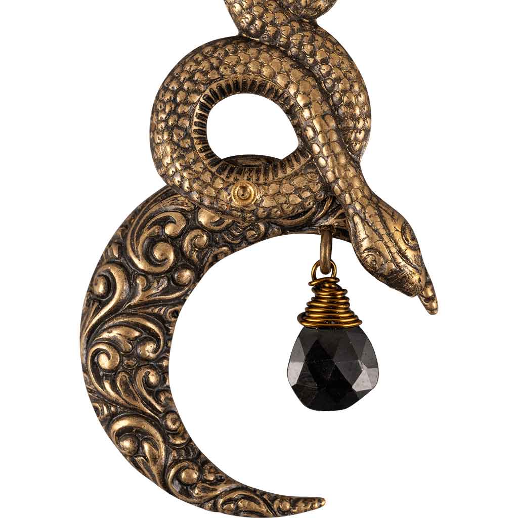 These earrings are inspired by Ishtar, the Mesopotamian goddess of love, war, and power in ancient mythology. The design depicts serpents coiling on top of a crescent moon, both significant symbols of her magical power. These baroque earrings are sold as a set of two.