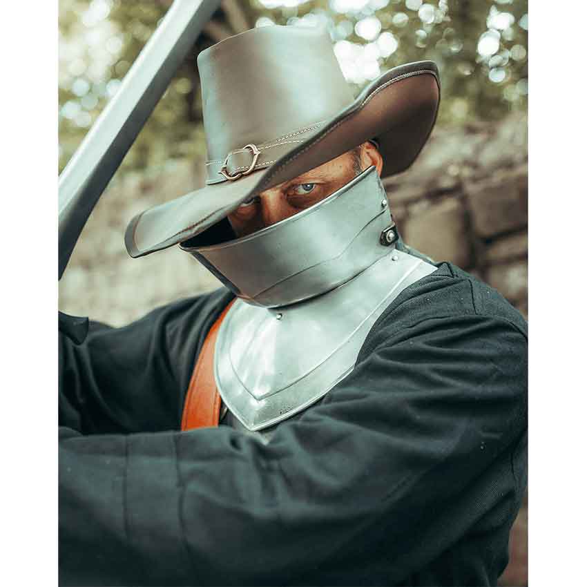 Your faithful squire helps you to prepare for a formidable battle. You make sure to wear armour and put on the Mortimer Bevor before the fight begins. Made from 18 gauge steel, the bevor features a polished finish. It has a neck guard that also protects the lower part of the face. Also, the bevor fastens in the back with strap. It has rolled edges and a streamlined look. There are no buckles or holes for attaching spaulders or pauldrons. This Mortimer Bevor is fantastic for cosplay and roleplaying events, like LARP battles.