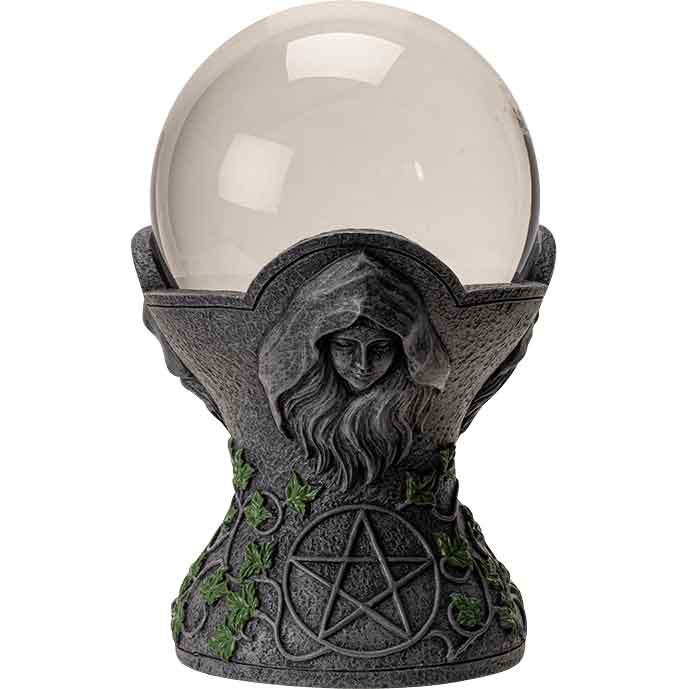 Discover a design depicting the triple goddesses, meticulously crafted from resin and hand painted for an artistic touch. On each side of this crystal ball stand are the images of the Mother, the Maiden, and the Crone. These figures represent the three stages of life and are powerful symbols in neopagan mythology. Their faces are on each side of the crystal ball. The Mother’s face is above the pentacle, a symbol of protection and vitality. Next, the Maiden is above the waxing crescent moon, representing new beginnings and the bounty of youth. The Crone, sitting above the waning crescent moon, symbolizes the end of life. In between each face are intricate vines and leaves, adding texture to the stand, detailed and hand painted to resemble dark grey ancient stone.
