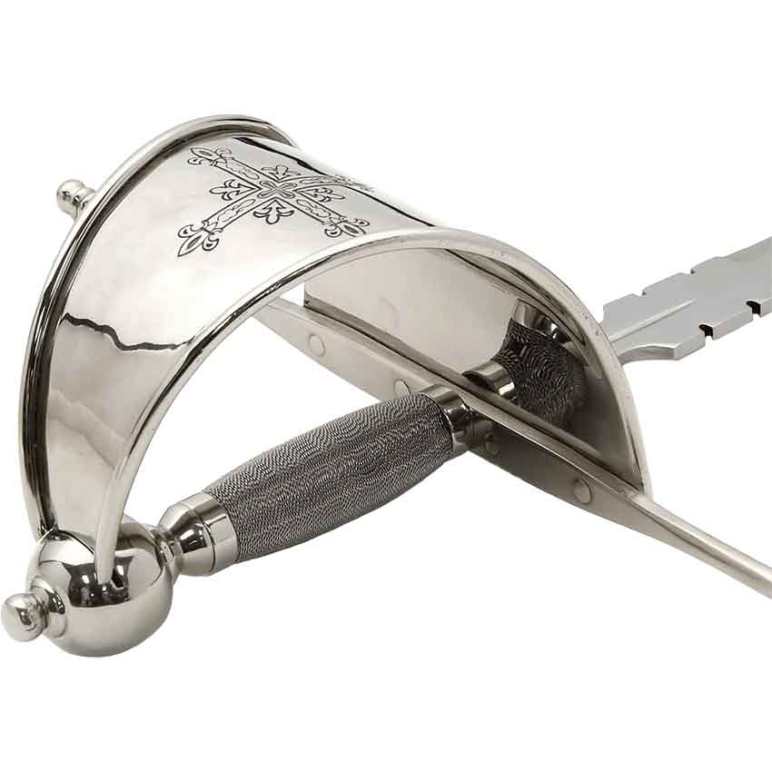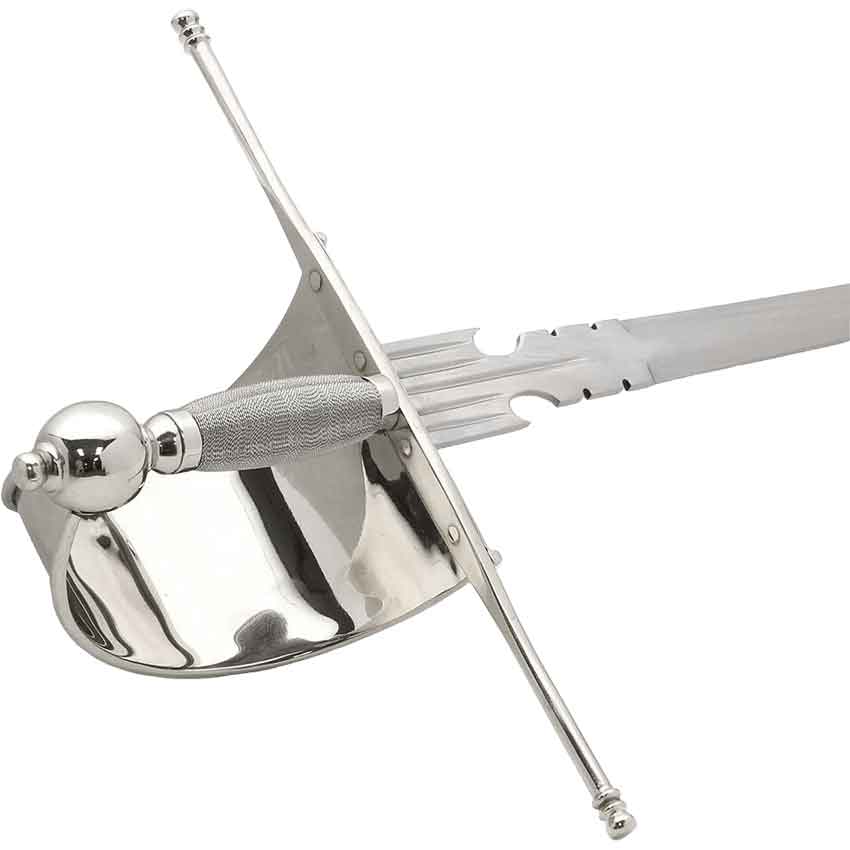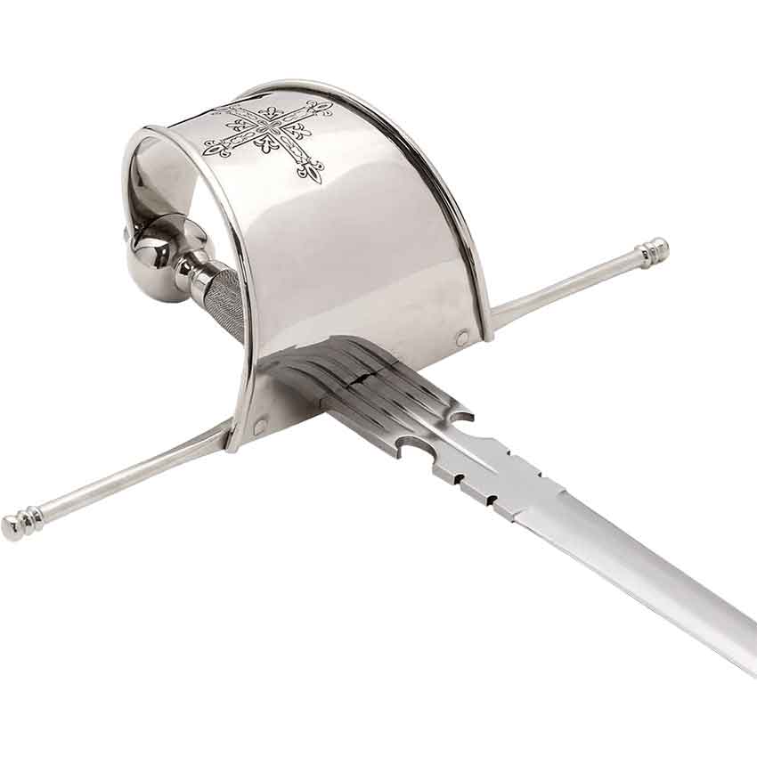 Carried at the back for a left hand draw, the main gauche was often brought into play with the rapier for a two handed fighting style. This dagger has cut-outs and notches to slow or disrupt an opponents blade, while the hand is well-protected by the knuckle bow. This main gauche matches our Musketeer Rapier, which can be purchased separately.