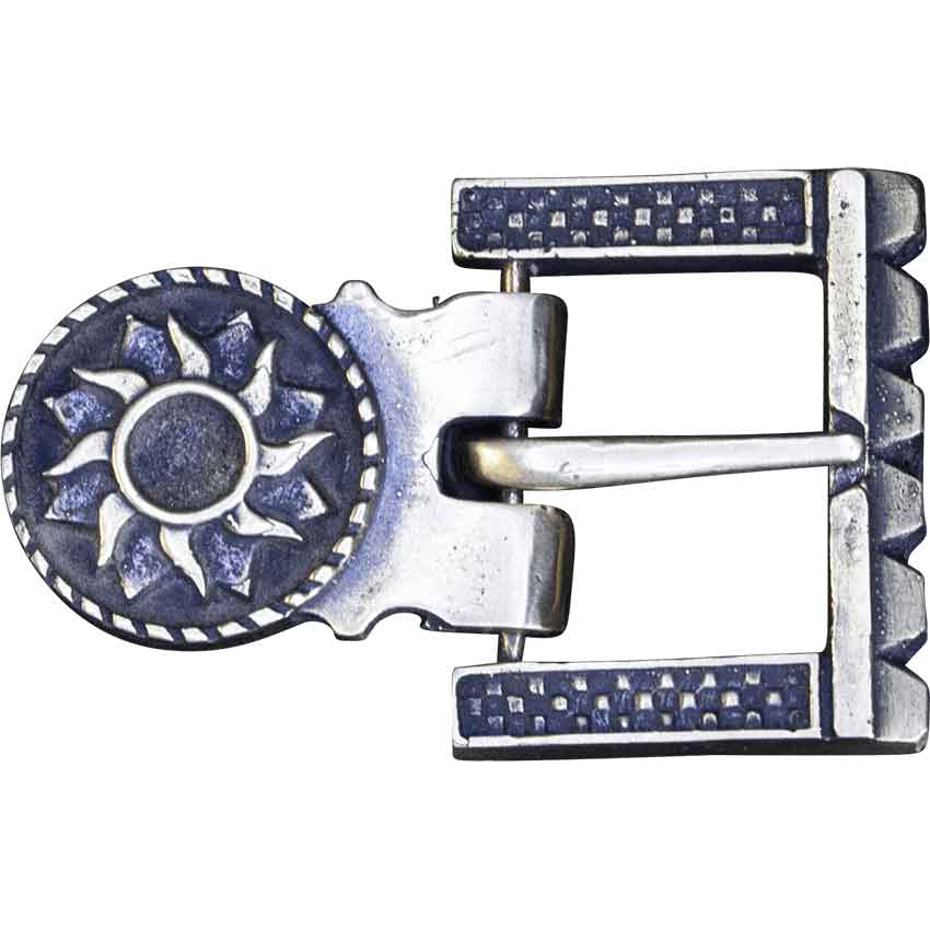 The buckle showcases the iconic Nilfgaardian sun, a symbol of power, set against a backdrop of intricate patterns. The frame has notched crenellations at the front and checkered patterns on the sides, adding layers of depth to the design. In the center is a square hole where the prong rests.