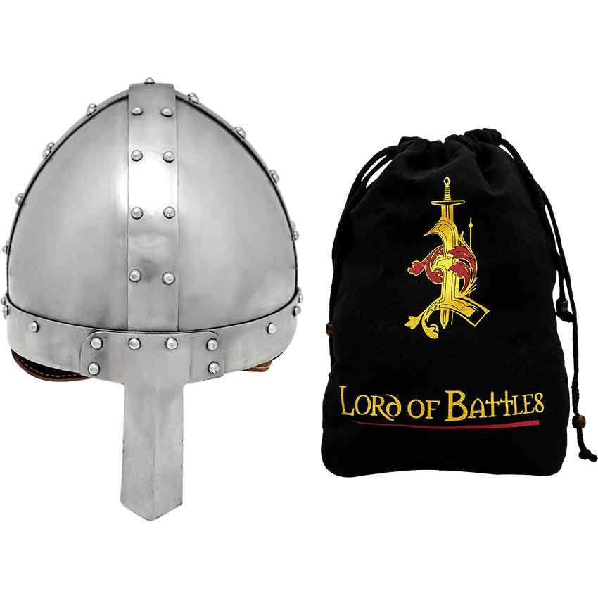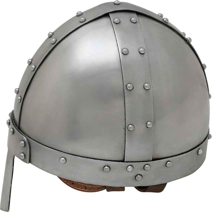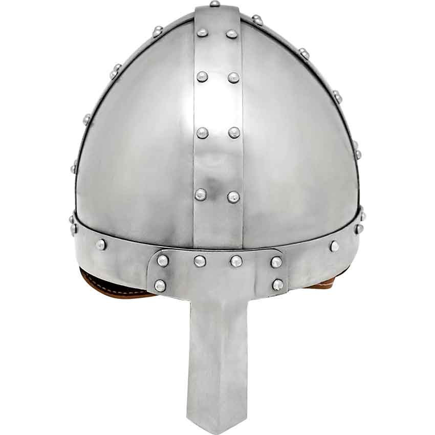 Don this helmet, and you are not just putting on a piece of armor; you are stepping into a piece of history.This Norse helmet features riveted reinforcing strips across the top and around the bottom rim. Rivets also secure the pointed nasal guard in place.
