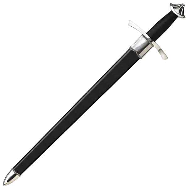 Now Cold Steel is pleased to offer a battle ready version of this famous sword. Like the original and the trainer weapons based off its design, this combat sword offers a long, wide blade with fully sharpened edges and a very useful point. Light enough to easily wield with one hand, a single broad fuller in the center of the blade lessens the weight, improves balance, and adds the stiffness needed to withstand heavy blows. The hilt of our Norman Sword is also reminiscent of many surviving originals with upturned, spatulated quillons, a leather-over-wood grip, and a modified cocked hat pommel. This pommel shape was specially chosen because it allows more room for the hand, while counter-balancing the blade and serving as a weapon in its own right.