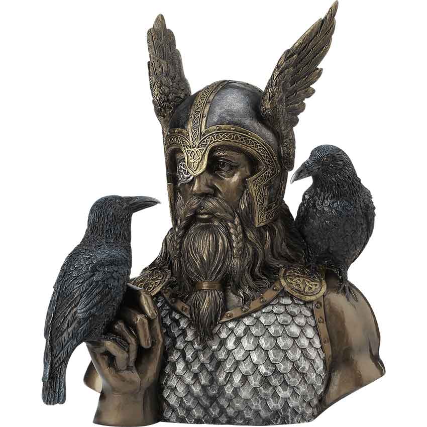 Bring the might of the Vikings to you home by displaying the leader of the Aesirs shown in the Norse God Odin with Ravens Bust Statue. Made from polystone, this hand-painted figure depicts Odin in a bronze color from the chest up. Odin wears silver-colored scaled armour and a winged helmet. Golden ornate knotwork adorns the edges of the helmet in addition to his shoulders.