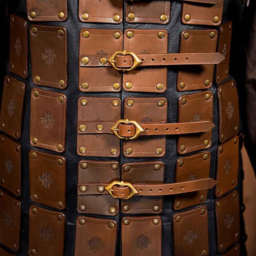 - Attention to Detail: Each brown, rectangular leather plate that adorns the armour features embossed knotwork detailing, adding a dash of intrigue and historical authenticity to the piece.