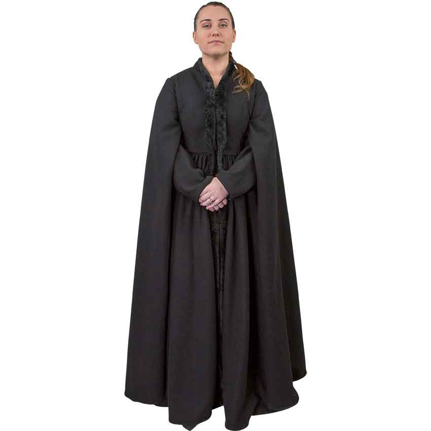 When spending time in the harsh and cold kingdom to the north, dress in a way that shows both your elegance and ferocity. The Northern Winter Dress is a beautiful medieval fantasy gown with long drape sleeves and black faux fur trim. The black medieval gown is made of a warm cotton blend and has matching black satin lining on the inside of the long outer sleeves and the torso. Beneath the dramatic, full length drape sleeves are closer-fitting inner sleeves. The torso laces up the back for a flattering, adjustable fit, and it is secured at the front with hidden hook and eye closures. Gathered at the waist, the skirt of the medieval winter gown is long and full, and the front is open to show off whatever layer you choose to wear underneath. Black faux fur trims the collar and down the entire front opening of the winter princess dress. Whether cosplaying as a lady of the north or building your medieval winter wardrobe, this black, faux fur trimmed dress is an excellent choice for historical, fantasy, and cosplay events.To give this dress the full look shown here, wear it with the A-Line Petticoat (MCI-145), sold separately.This item is handmade, therefore, it may vary slight from what is shown here.
