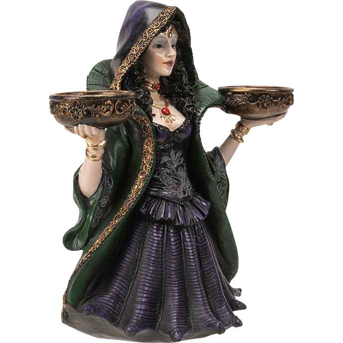 This unique craftsmanship breathes life into the design, making it a truly special addition to your home. The hooded witch cradles a cauldron in each hand, inviting you to indulge in the mystical atmosphere it creates. Please note it does not come with two votive candles. Her hood, featuring shimmering gold trim gracefully rests on her curly black hair. The witch wears a green robe with a high collar and matching gold trim over her gown.