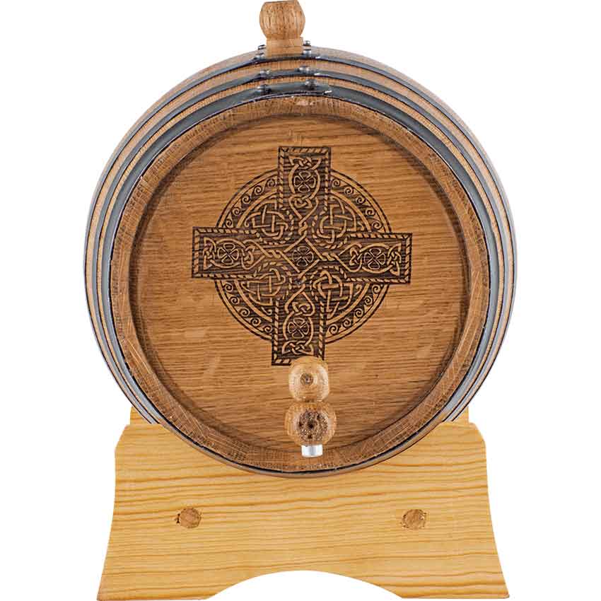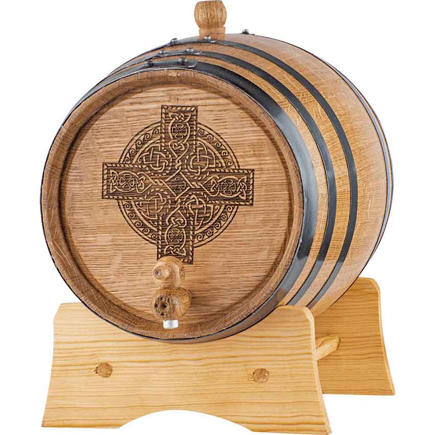 An appealing touch of Celtic style makes this Ornate Cross 5 Liter Oak Barrel look like an accent to your fine decor. Even better is that this accent is also a functional piece that can, at any time, hold fine spirits for you to enjoy! This handsome looking barrel is made entirely from fine American White Oak, with classic construction including metal bands around the barrel staves. These metal bands can be polished steel, brass, or blackened steel. Laser-burned into the wood on the barrels front is an incredibly detailed and ornate looking cross. The barrel features a medium char and is perfect for aging a variety of different spirits, including wine, mead, tequila, brandy, scotch, whiskey, rum, bourbon, and more! It comes complete with a stand, bung, wooden spigot, and storing tablet. As its name implies, it holds approximately 5 liters of liquid. This Ornate Cross 5 Liter Oak Barrel is one cask that you will want to keep on-hand and ready for use, thanks to its fine look – and that goes double for whenever you have it filled with something delectable and delicious to drink!