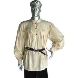 The average, everyday medieval person did not need fancy clothing. They needed something that was above all else, functional. They needed a garment like the Peasant Shirt, which features effective, simple construction without any frivolous decoration. This garment is made from 100% natural woven cotton. It is considered a medium-weight garment that strikes a healthy balance between weight and protection. The shirt features a small collar and a deep neckline that is secured with three fasteners. It can be closed or left open to suit personal taste. The full-length sleeves are loose-fitting on the arm and end in fitted cuffs. The Peasant Shirt comes in a variety of attractive colors. The shirt is also pictured above with a leather belt, which is not included. The Peasant Shirt is a simple but effective medieval-styled garment that can and should be used by all professions and classes. Peasants and workers will love it for its rugged simplicity and its comfort, where-as the upper-class nobility will enjoy it for the freedom and potential it offers.