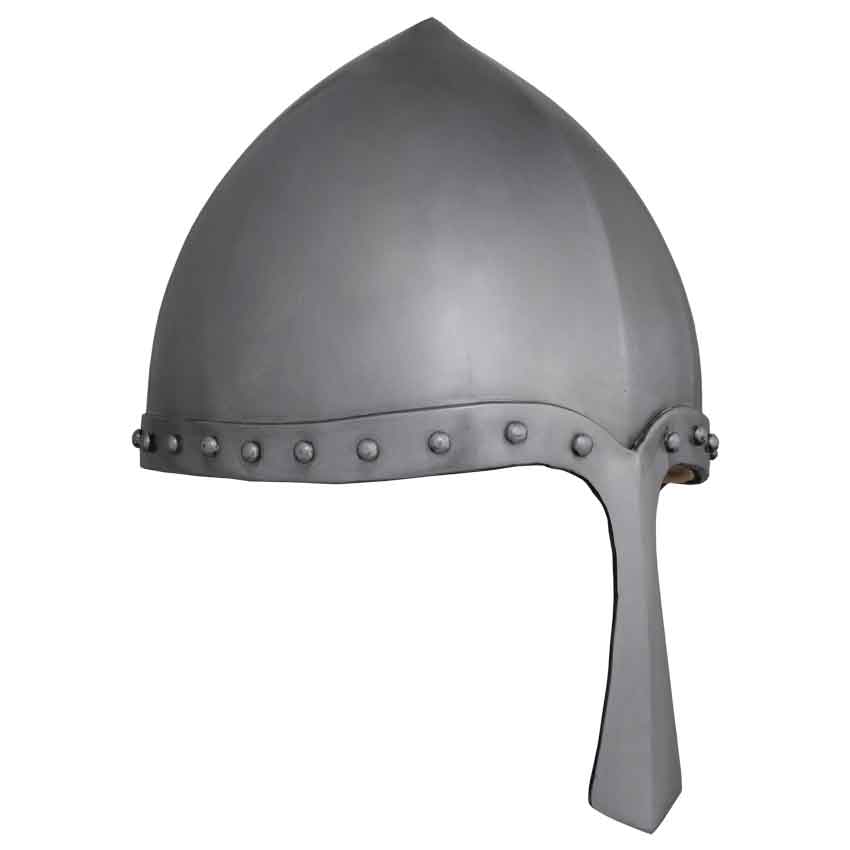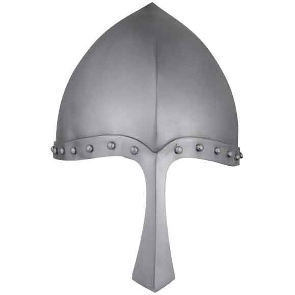 Based on a 12th century Mediterranean style, it has a rounded, conical design. A slight ridge runs along the center. There is a reinforcing strip that runs around the bottom edge of the helmet. Rivets secure it in place. This strip forms the nasal guard in front. The nasal guard widens slightly towards the pointed bottom.