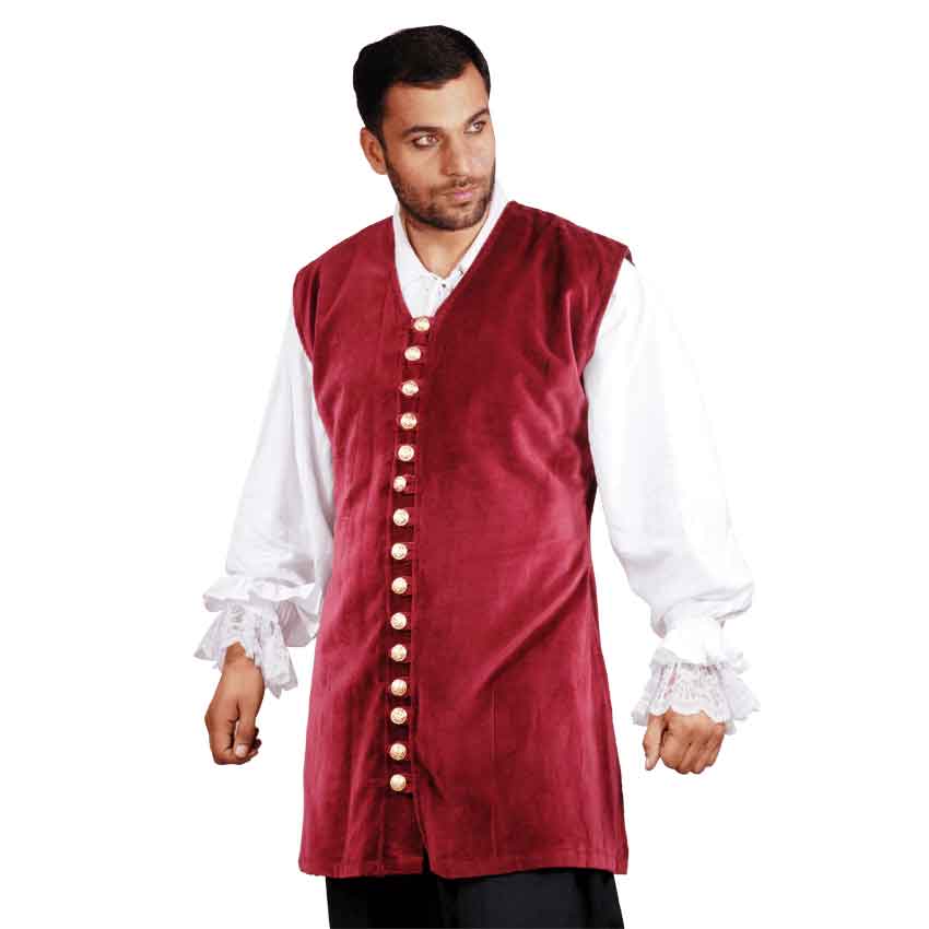 The Pirates Captain Benjamin Long Decorated Vest is a simple yet elegant vest for any pirate outfit. The Captain Benjamin long vest is wine colored coat made from cotton velvet with fully functional golden buttons in the front. The Pirates Captain Benjamin Long Decorated Vest would finish any pirate outfit as well as Medieval and Renaissance outfits. A pirate outfit is not complete without this gorgeous pirate captain vest.