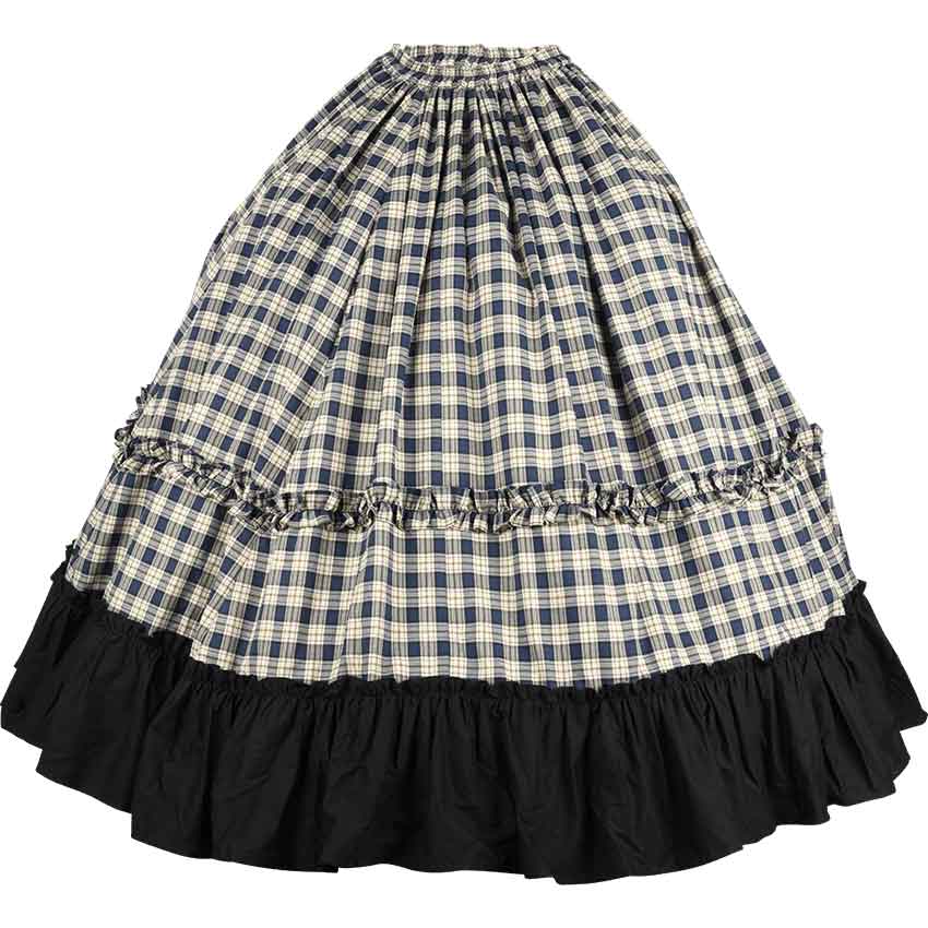 Whether you are on the side of the North or the South, a lady is sure to look wonderful while wearing the Plaid Civil War Skirt to their event. Made from a cotton blend, this skirt comes in a range of sizes and color options. It features the wide cut shape typical of the period. It works best with a hoop skirt like the Civil War Hoop Skirt (MCI-240), sold separately. At the bottom of this skirt, there is a black ruffled hem. The hem will always be black regardless of skirt color. There is a line of ruffles higher up on the skirt which matches the overall pattern. Finally, the elastic waistband makes putting the skirt on and wearing it much easier and more comfortable. Wear the Plaid Civil War Skirt to any roleplaying event, historical reenactment, or stage production.