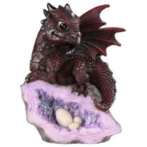 With a shimmering lavender crystal as the first addition to its hoard, this young dragon has much to be proud of! The Purple Crystal Baby Dragon Statue shows the fantasy creature as it perches atop the open face of the stone. Small wings spread from its back, and a pleased expression fills its large eyes. The dark dragon displays a deep red-violet color to complement its crystalline treasure. Crafted from cold cast resin, this dragon figure displays excellent detail down to the spines extending along its back and tail. With a height of only five inches, this dragon sculpture is the perfect size for showcasing on a desk or shelf, making it a charming gift or collectible as well.