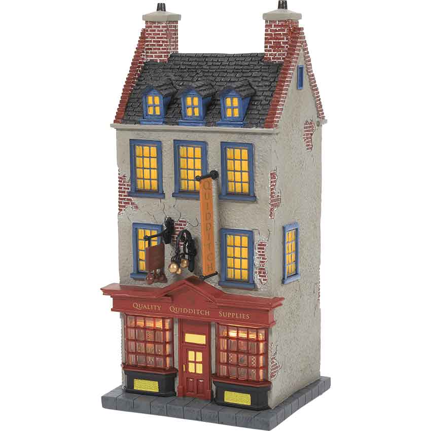 If you are a Quidditch fan, then you are sure to appreciate the Quality Quidditch Supplies from the Harry Potter Village by Department 56. Made from polyresin, this officially licensed statue depicts the Quidditch shop. It features beige plaster with sections revealing the brick beneath. The hand-painted building has a red door and bay windows in front. The trim over the door reads Quality Quidditch Supplies.