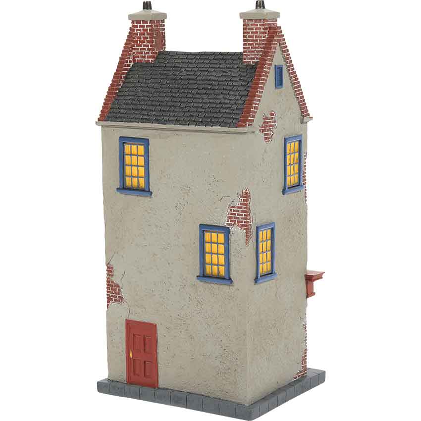 Above the door are a couple of signs and a set of golden ornaments. One sign is taller than the other and has a bright orange color. It reads Quidditch. The other sign is red and has the same phrase as the front. There are multiple windows surrounding the signs. They have blue trim. There are windows on the sides and back as well. All of the windows light up with a 120V light bulb and a plug-in power cord. In addition to the windows, the back of the Quidditch shop has another red door. There is a pair of chimneys on the roof. Put this hand-painted building on display for all to see in your home. This hand-painted building figurine is made by Department 56.