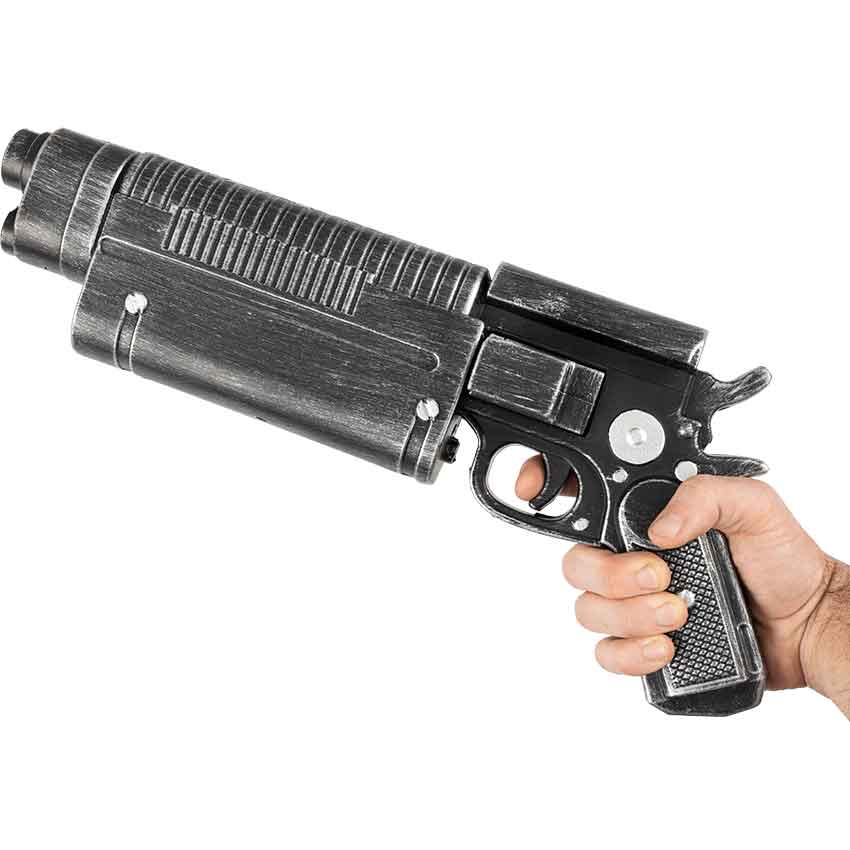 Made entirely from foam, this pistol is inspired by galactic conflicts and the noble warriors who fought to save the galaxy. This foam blaster pistol is an excellent cosplay prop, and cannot fire ammunition of any kind. It has a rustic aesthetic with an iconic sci-fi design. The blaster pistol is painted gunmetal grey with silver accents. The grip and the trigger have fake rivets for added depth. The checkered grip gives you a secure and ergonomic hold. It also has a trigger for an added realistic touch. The side-mounted magazine is a truly unique touch to this foam blaster pistol. Moving down the length, this foam sci-fi pistol has an under barrel grip and a grooved slide. Please note neither the magazine nor the slide moves. The stubbed muzzle is closed.