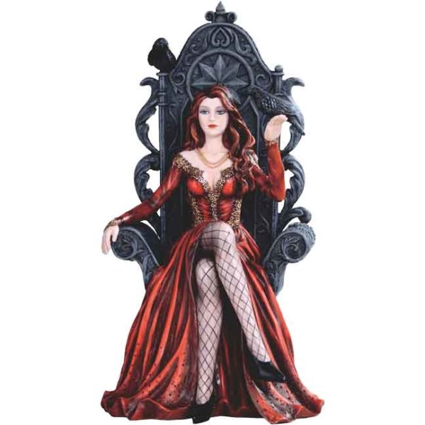 The sorceress depicted in the Red Witch in Throne Statue appears calm and confident in her regal seat. Made from cold cast resin, this hand-painted statue depicts a woman on a highback throne. The woman wears a richly colored red dress. Intricately detailed trim adorns the bodice of the dress. The witch rests her right hand on the throne while the other hand is held in the air. A raven sits on her hand. There is another black bird sitting on the opposite side of the throne. It sits on the back rest of the throne. The back of the throne has a starburst design with scrollwork surrounding it. Scrollwork also decorates the arms of the throne. Add this red witch statue to your gothic collection. It makes a wonderful addition to any dark decor or a gift to a fan of fantasy.