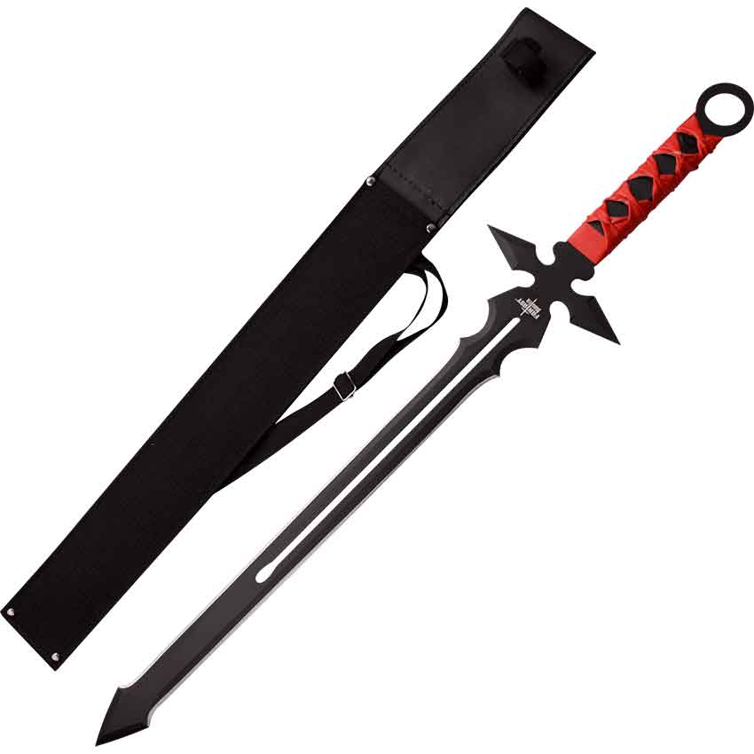 What necromancer, knight, or mage wields this wicked short sword in the fray of battle? The Red Wrapped Fantasy Short Sword possesses a unique design inspired by the imagination and creativity found in magical legends and tales. The stainless steel sword displays a blackened blade with a handle wrapped in vivid red synthetic cord. The crossguard arrows off to each side, and the tip of the fantasy sword flares slightly for a striking look. A thin cutout runs down the center of the black blade. A ring appears at the end of the handle. This decorative sword comes with a black nylon sheath for storing or carrying.