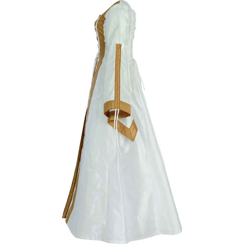 For noble ladies, royalty, and spellcasters alike, the Renaissance Sorceress Dress in White is an enchanting addition to historical and fantasy wardrobes. Made of smooth taffeta, this medieval gown comes in a variety of accent colors. The long, flared sleeves feature an accent color trim at the cuff, and they can be worn down or cinched up using the adjustable, integrated drawstrings. The front of the dress has an inset accent panel at its center, bordered on either side by matching accent fabric. Lacing over the torso of this front panel creates the impression of layering. At the back, further lacing adjusts the dress for the perfect fit. Elegant and intrepid, this stylish Renaissance dress is offered in a range of sizes and is perfect for Renaissance fairs, reenactment events, masquerade balls, and other costumed occasions.